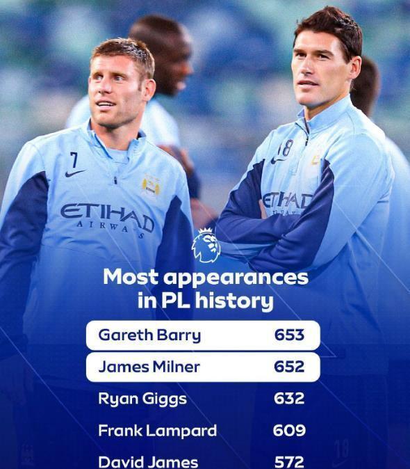 本轮英超布莱顿对阵水晶宫的比赛,若本场出场,米尔纳就将追平巴里的纪录;并极有可能在下轮超越巴里,独享“英超出场第一人”的荣誉。此外,米尔纳还保持着另一项独特纪录,他已经在24个不同的英超赛季中出场,超越了吉格斯的22个赛季,独享历史第一。