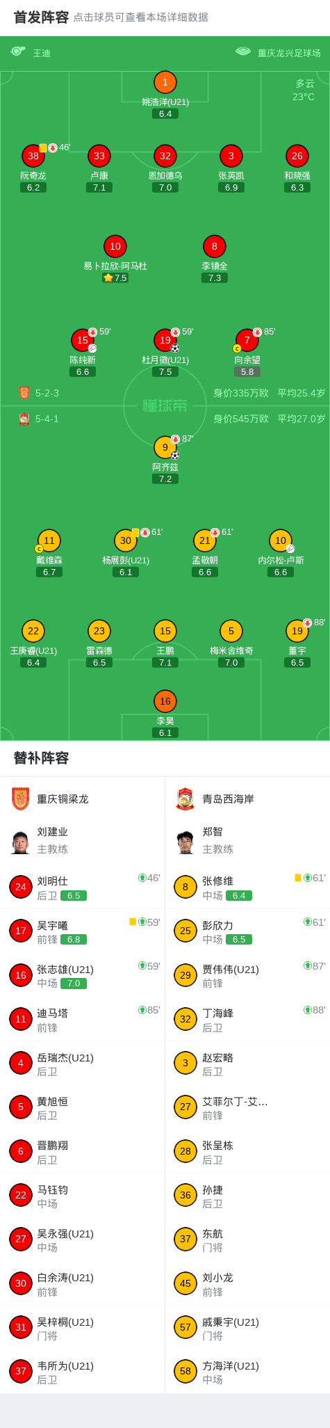 北京时间4月26日中国足球超级联赛第8轮,重庆铜梁龙主场对阵青岛西海岸。阿齐兹率先得分,杜月徵扳平比分。最终比分重庆铜梁龙1-1青岛西海岸。